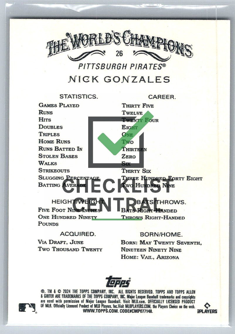 2024 Topps Allen & Ginter Nick Gonzalez #26 RC.