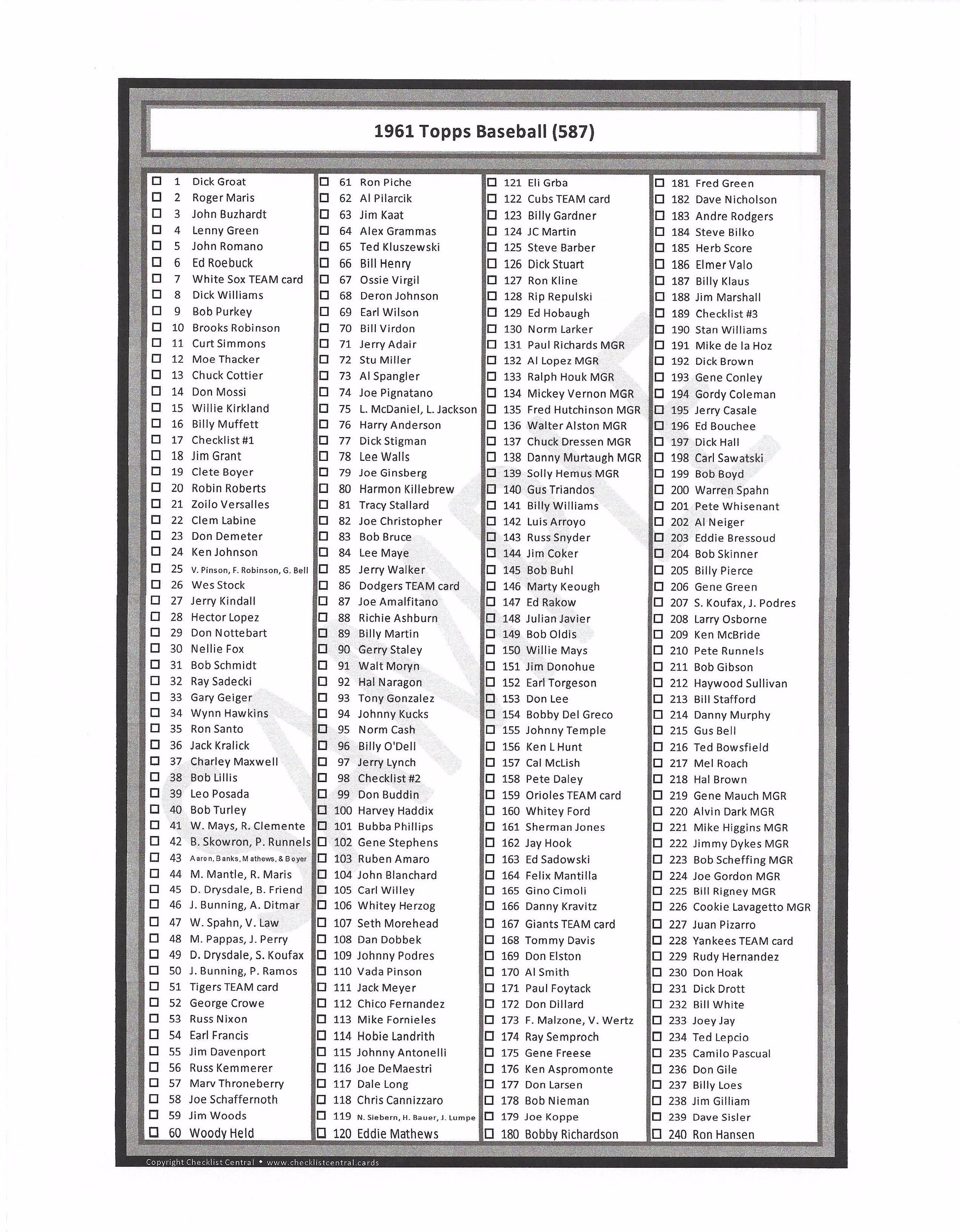 Digital Download: 1961 Topps Baseball Collector Series Checklist (587)