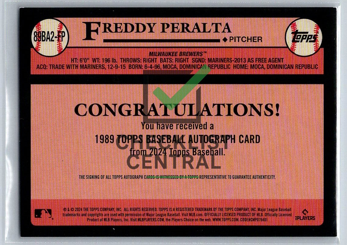 2024 Topps Update '89 Topps Baseball Autographs Freddy Peralta 89BA2-FP.