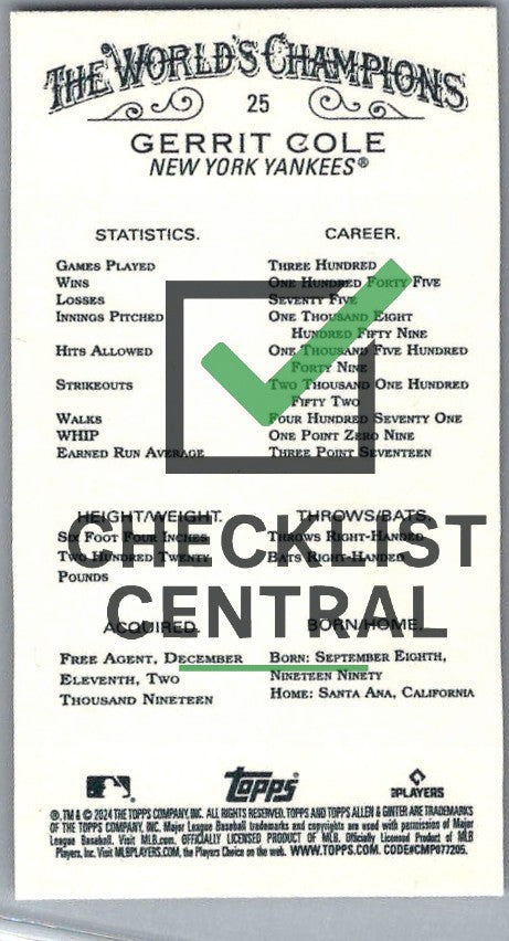 2024 Topps Allen & Ginter Mini Gold Border Gerrit Cole #25.