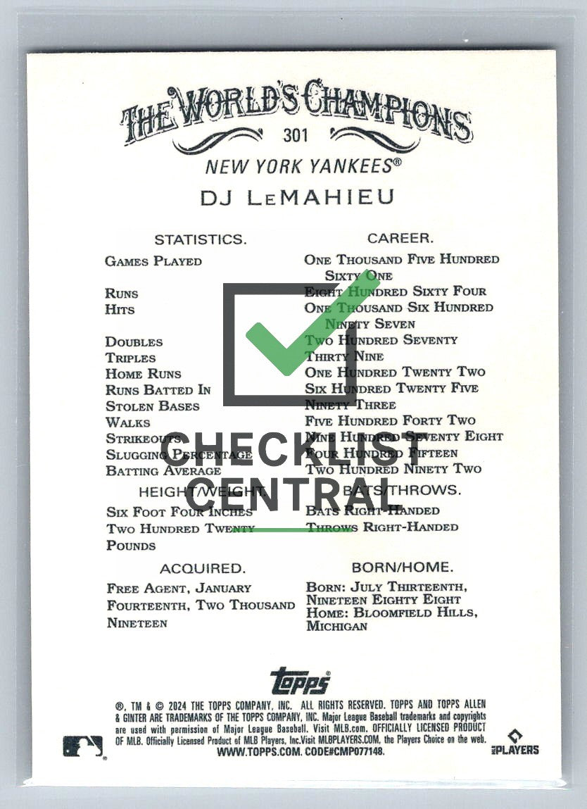 2024 Topps Allen & Ginter DJ LeMahieu #301.