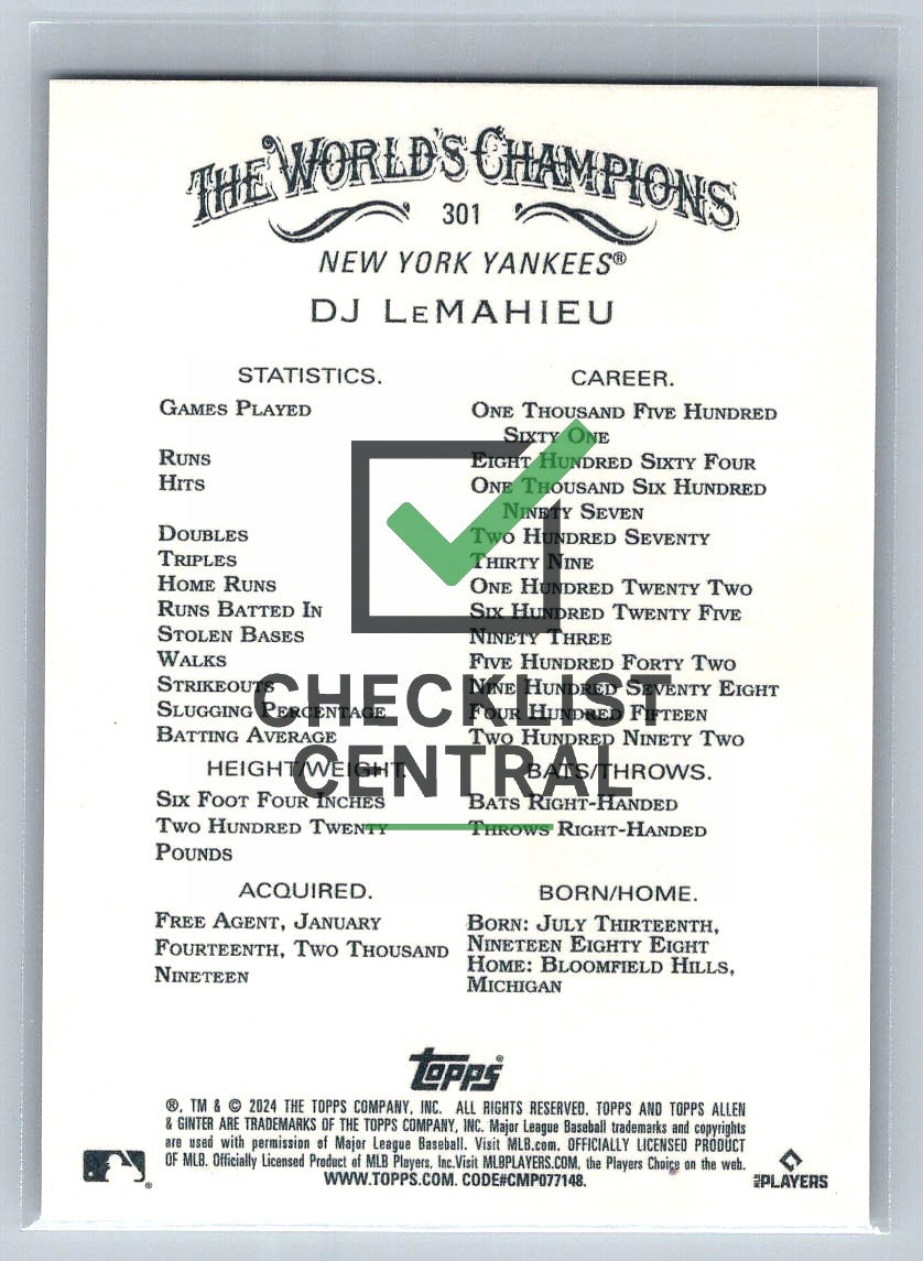 2024 Topps Allen & Ginter DJ LeMahieu #301.