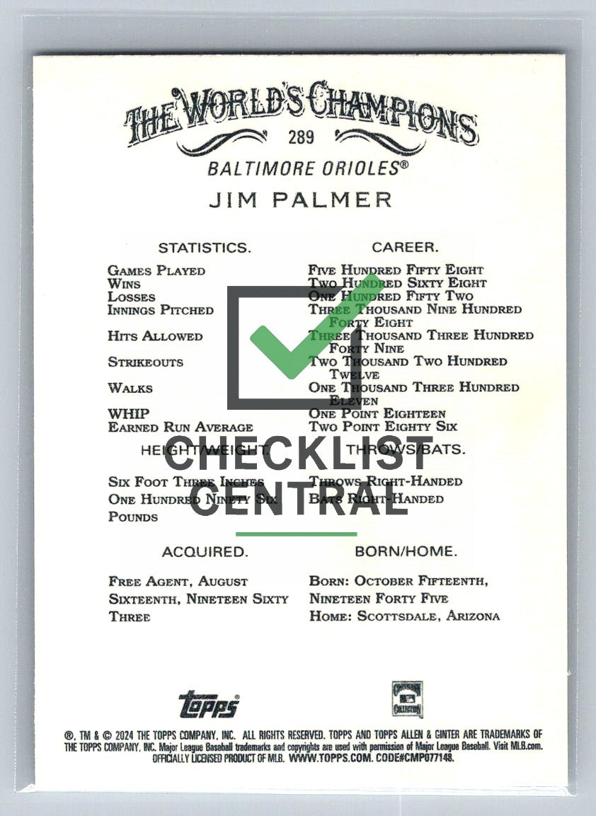 2024 Topps Allen & Ginter Jim Palmer #289.