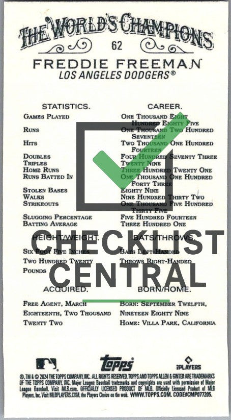2024 Topps Allen & Ginter Mini Gold Border Freddie Freeman #62.