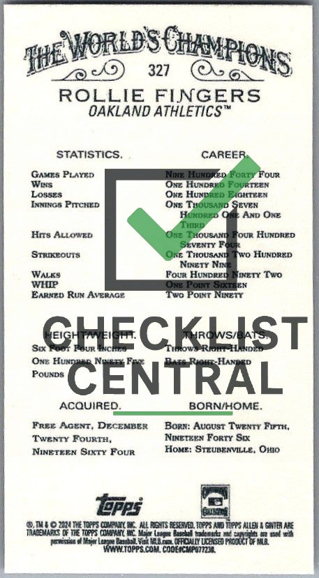2024 Topps Allen & Ginter Mini Gold Border Rollie Fingers #327.