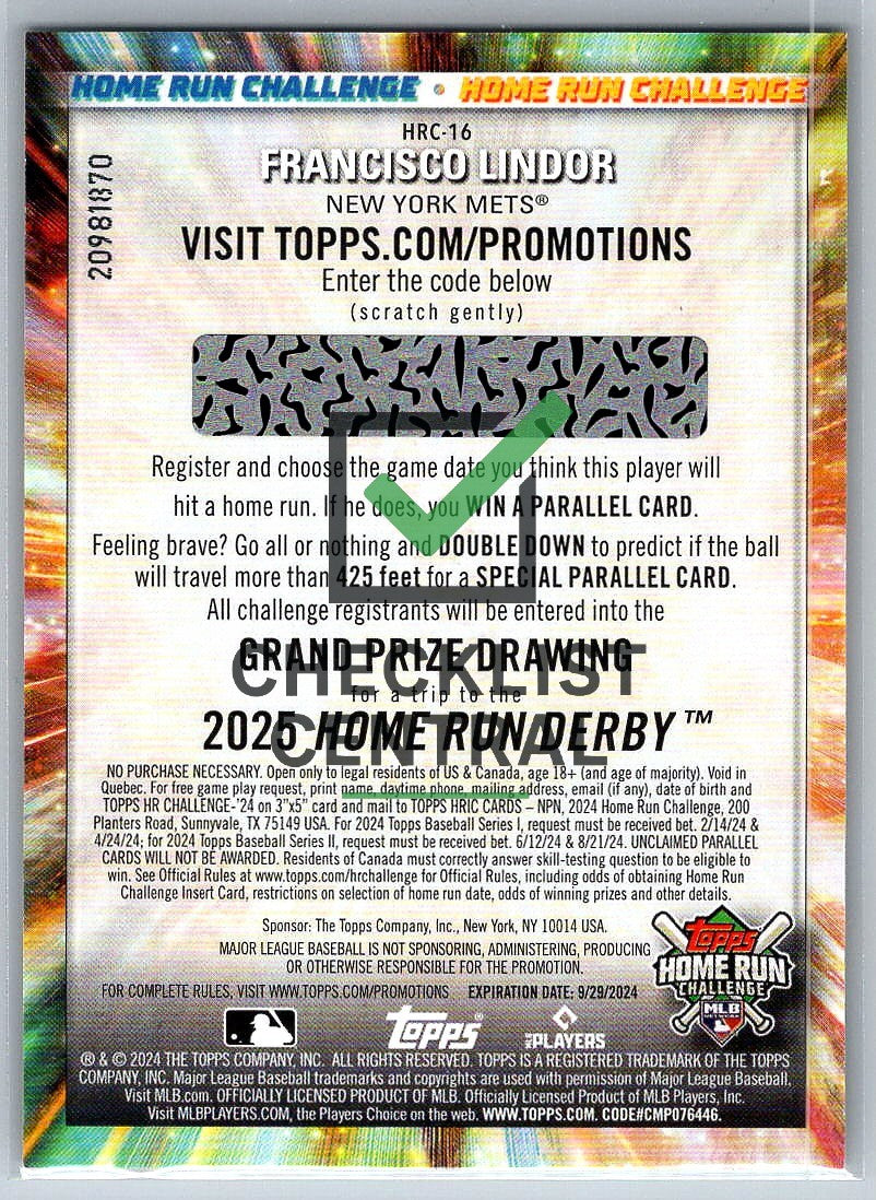2024 Topps Home Run Challenge Code Cards Series 2 Francisco Lindor #HRC16.
