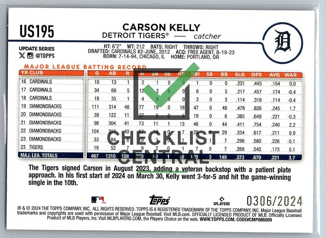 2024 Topps Update Gold Carson Kelly #US195 - 0306/2024.