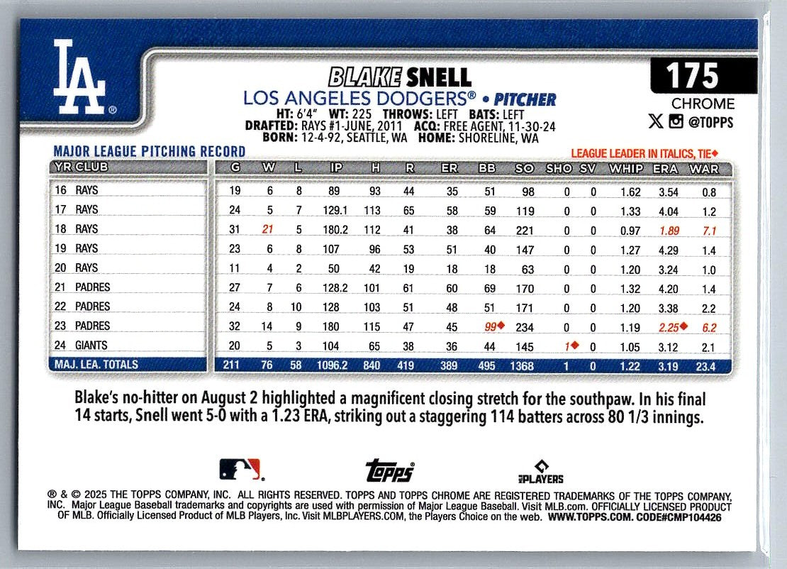 2025 Topps Chrome RayWave Refractors Blake Snell #175