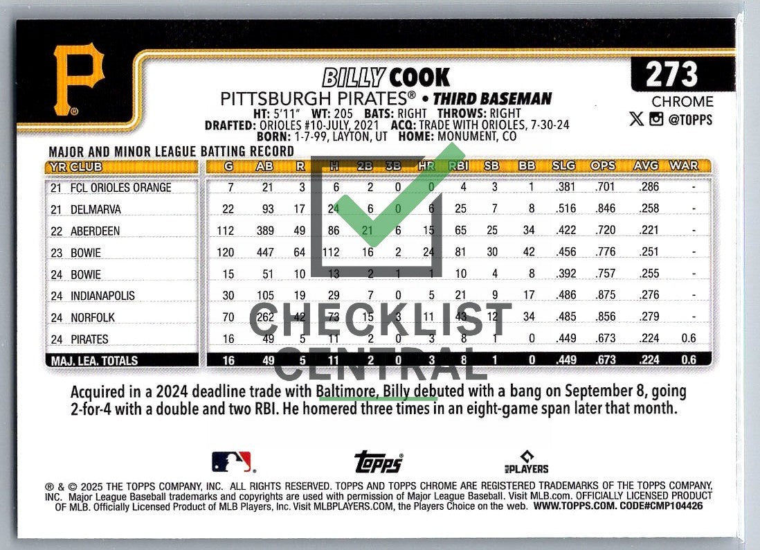 2025 Topps Chrome X-Fractors Billy Cook #273
