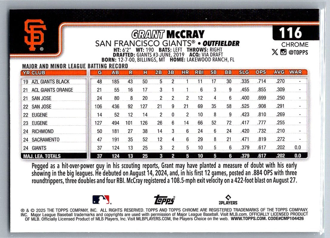 2025 Topps Chrome X-Fractors Grant McCray #116